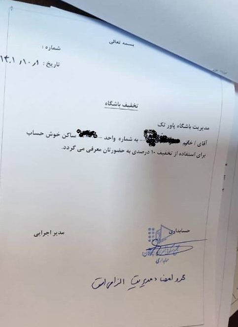 به استحضار می رساند با توافق صورت گرفته بین مدیر محترم اجرایی و مدیریت باشگاه مجتمع، مقرر شد جهت تشویق هر چه بیشتر ساکنان به ورزش و همچنین قدردانی از ساکنان خوش حساب، به ساکنانی که تعهدات مالی واحد  به مجتمع (از جمله شارژ) را در زمان مقرر پرداخت می کنند به همراه رسید برگه مهر و امضا شده تخفیف استفاده از سالن ورزشی مجتمع صادر خواهد شد که با ارائه آن به باشگاه از تخفیف 10 درصدی در آن ماه برخوردار خواهند شد.
