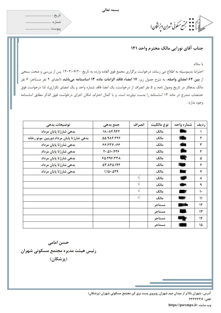 پیرو درخواست جمعی از مالکان محترم در مورد برگزاری مجمع فوق العاده مالکین، و عدم حد نصاب امضاهای لازم، هیئت مدیره طی نامه ای به معترضین بزرگوار، ضمن اعلام رد درخواست با ذکر دلایل از آنان دعوت نمود در صورت اصرار به برگزاری مجمع ضمن برطرف کردن ایرادات و رعایت شرایط اساسنامه درخواست مجدد خود را ارسال نمایند. گزارش این درخواست و پاسخ هیئت مدیره را در لینک زیر مطالعه بفرمایید.