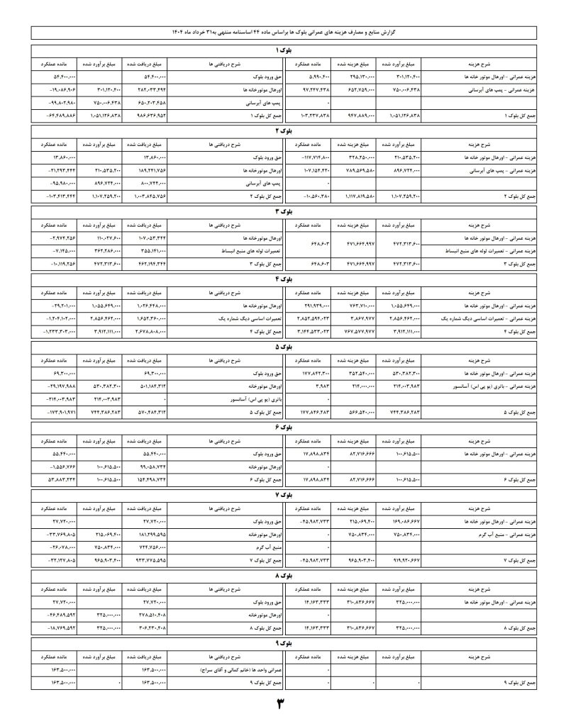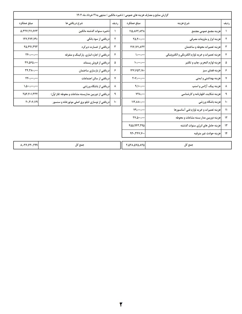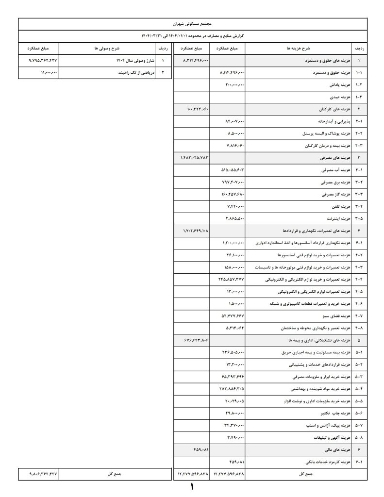 منطبق بر تکلیف بند 6-22 اساسنامه، گزارش منابع و مصارف مجتمع در 3 ماه اول 1404 در 3 صفحه در اختیار ساکنان عزیز قرار داده می شود.