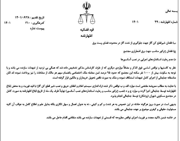 در اولین اقدامات در چند نوبت اظهارنامه های قانونی از طرف هیئت مدیره برای سازنده ارسال گردید ( رونوشت تمامی آنها به رئیس محترم کارگروه نیز ارسال شده است)