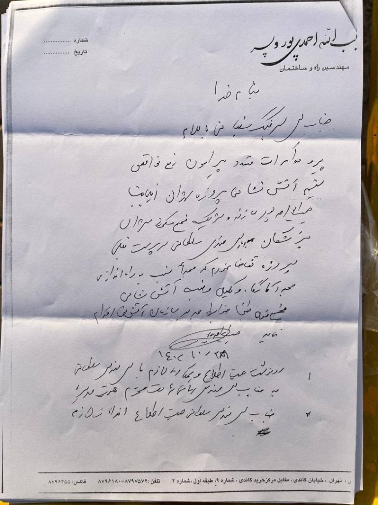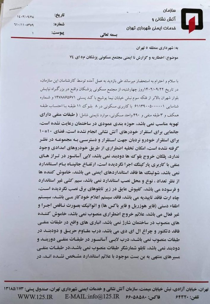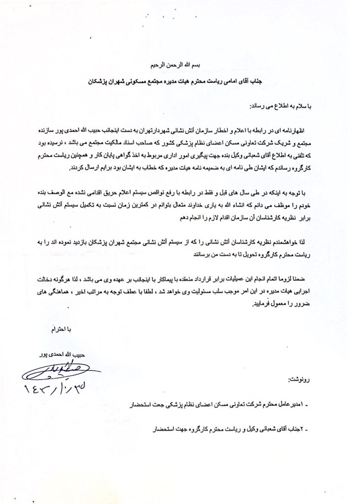 در جلسات با سازنده پیرامون موضوع سازنده از هیئت مدیره درخواست  کردند با استفاده از وسایلی که برای سیستم اطفای حریق در انبار مجتمع موجود است کمک کنند حداقل سیستم اطفای حریق بلوک ها راه اندازی شود و مقرر شد جناب آقای شعبانی اقلام را در اختیار هیئت مدیره قرار دهند، که متاسفانه نه تنها عملی نشد بلکه در یک اقدام کاملا متضاد ناگهان نامه ای به دست هیئت رسید که هرگونه دخالت هیئت مدیره در این امر را منع نمود (نامه های زیر را مشاهده بفرمایید)