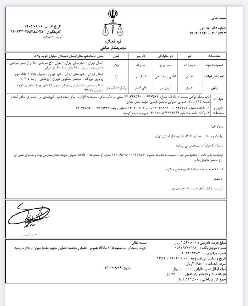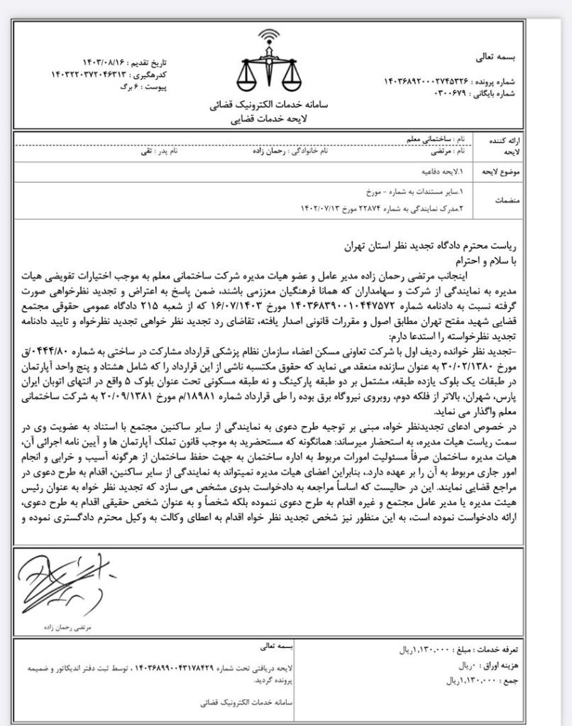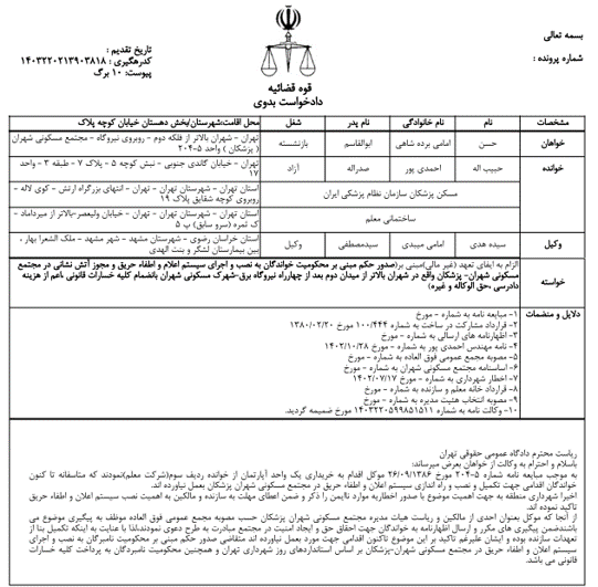 نهایتا بنا به مصوبه مجمع هیئت مدیره، از طریق جناب آقای مهندس امامی ریاست هیئت اقدام به طرح دادخواست قضایی نمود که دادخواست را در تصویر زیر مشاهده می فرمایید.