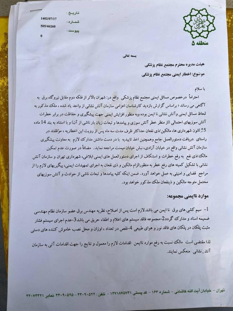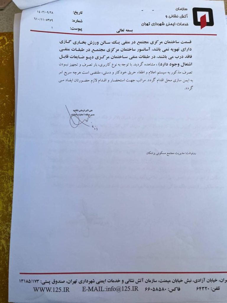 گزارشی پیرامون اقدامات هیئت مدیره پیرامون موضوع اطفای حریق
