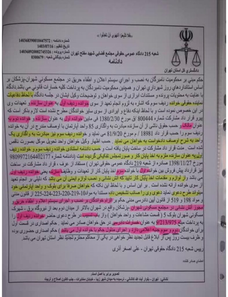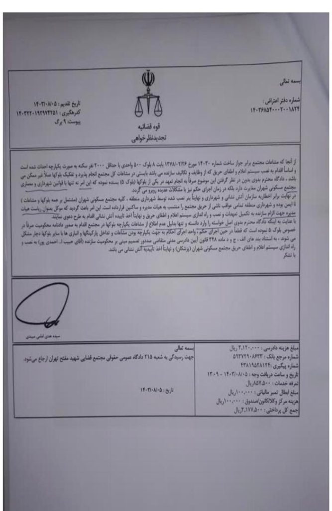 متاسفانه مشکلی که در این مسیر طرح شکایت به وجود آمده است عدم پذیرش دادخواست رئیس هیئت مدیرت از سوی همه مالکان بود که هیئت مدیره در حال پیگیری موضوع می باشد.
