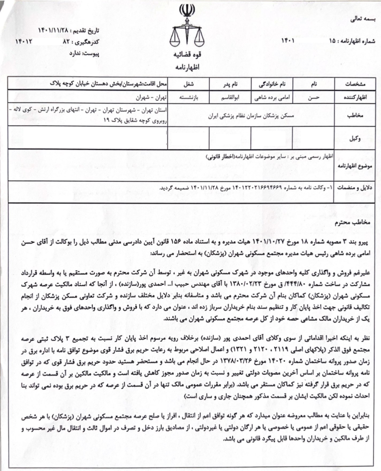 همچنین توجه شما را به تصویر اظهارنامه ارسال شده مذکور جلب می نماییم.