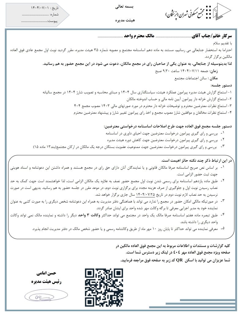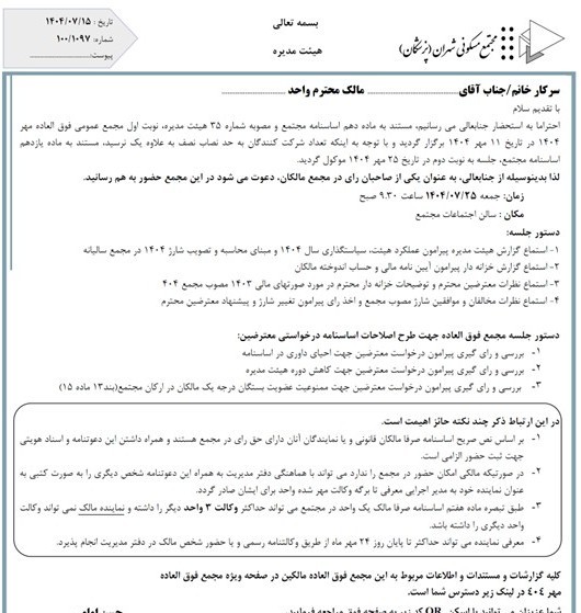 توصیه هیئت‌مدیره:  با توجه به اهمیت موضوع مجمع ۲۵ مهرماه، لطفاً مالکین محترم شخصاً در مجمع حضور داشته باشند.