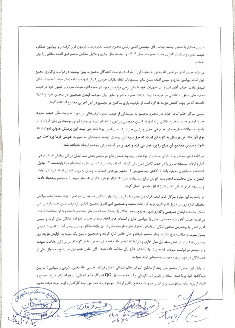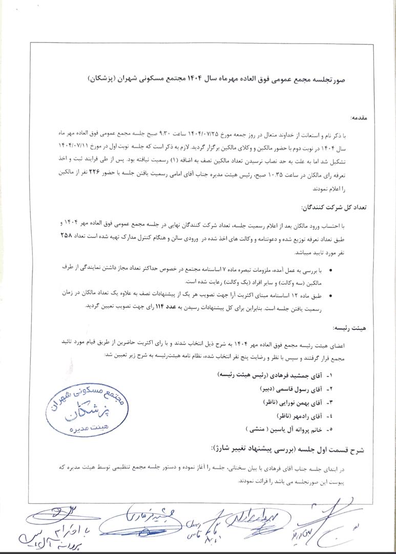 با استعانت به خداوند متعال، مطابق با الزام بند هفدهم اساسنامه، صورتجلسه مجمع عمومی فوق العاده مهر ماه سال 1404 که پس از تهیه توسط هیئت رئیسه منتخب مجمع تحویل هیئت مدیره گردید، جهت استحضار مالکان عزیز به طور رسمی منتشر می گردد.