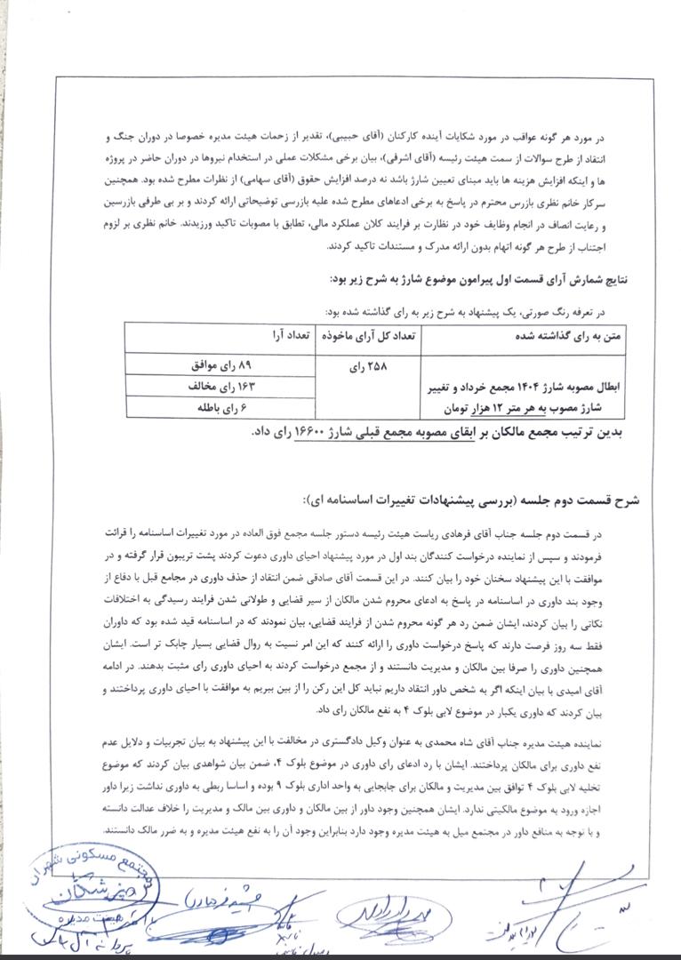 هر چند شارژ مصوب مجمع سالانه با ساعتها بررسی کارشناسی به مجمع پیشنهاد شده و کاملا قانونی است و به نظر هیئت مدیره اداره مجتمع با توجه به شرایط ابرتورمی حاضر و وضعیت بسیار سخت استخدام نیرو با این عدد هم دشوار است، و اساسا طبق اساسنامه پیشنهاد شارژ بر عهده هیئت مدیره است، و پیشنهاد شارژ غیرکارشناسی 12 هزار تومان بدون در نظر گرفتن شرایط را به هیچ وجه به صلاح مجتمع نمیداند و این را بارها اعلام کرده است، ولی اعتقاد دارد مراجعه به آرای عمومی می تواند فصل الخطاب همه اختلافات است و بدین جهت راسا برگزاری مجمع را اعلام می کند.
