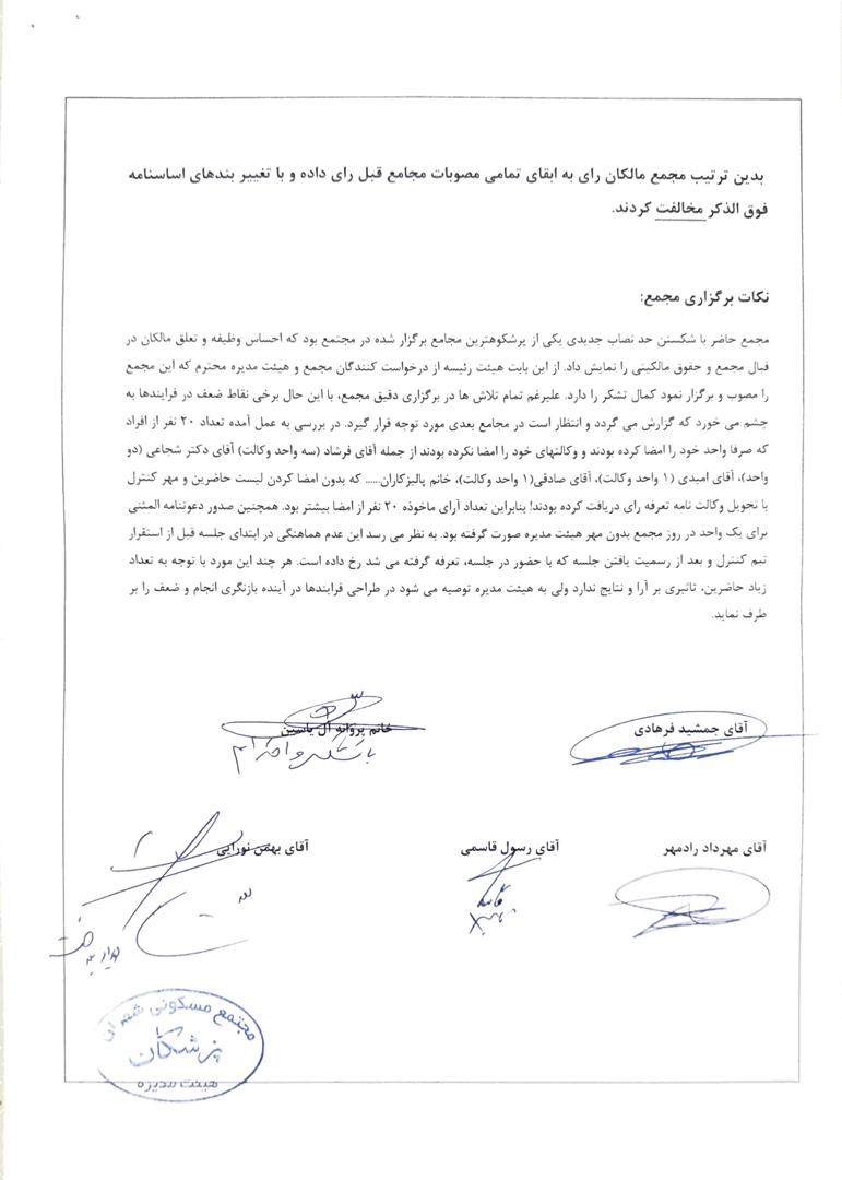 لازم به توضیح است این صورتجلسه در بوردهای لابی های مجتمع نیز نصب خواهد شد و همچنین از طریق پیامک به اطلاع مالکان نیز رسانده خواهد شد.