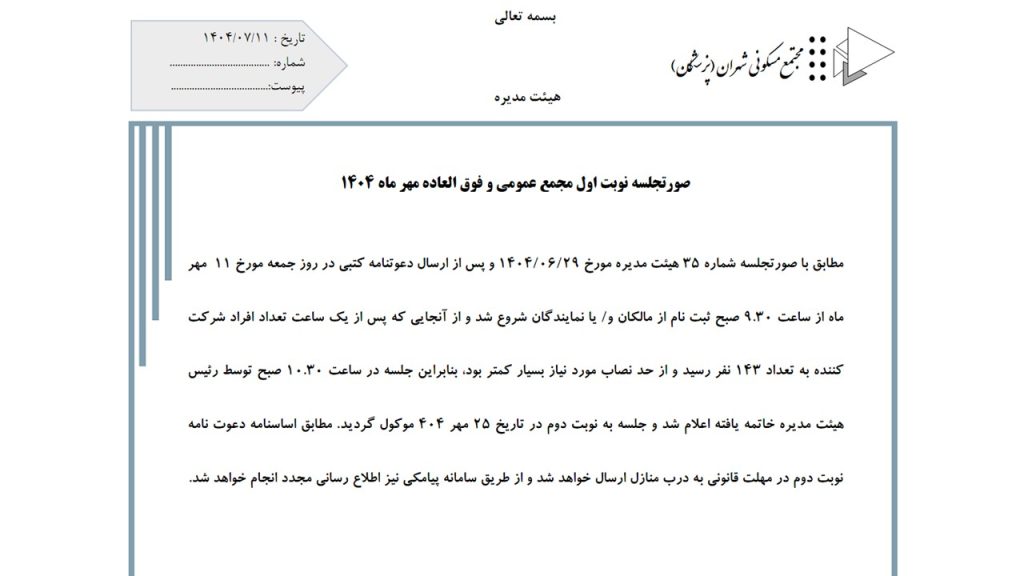 منطبق بر اساسنامه، دعوتنامه نوبت اول مجمع فوق العاده مهر 1404 از روز سه شنبه 1 مهر ارسال گردید.